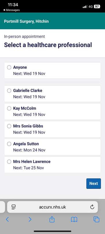 Booking links will look like this:You will be offered every suitable clinician. You can click 'Anyone' or a specific clinician